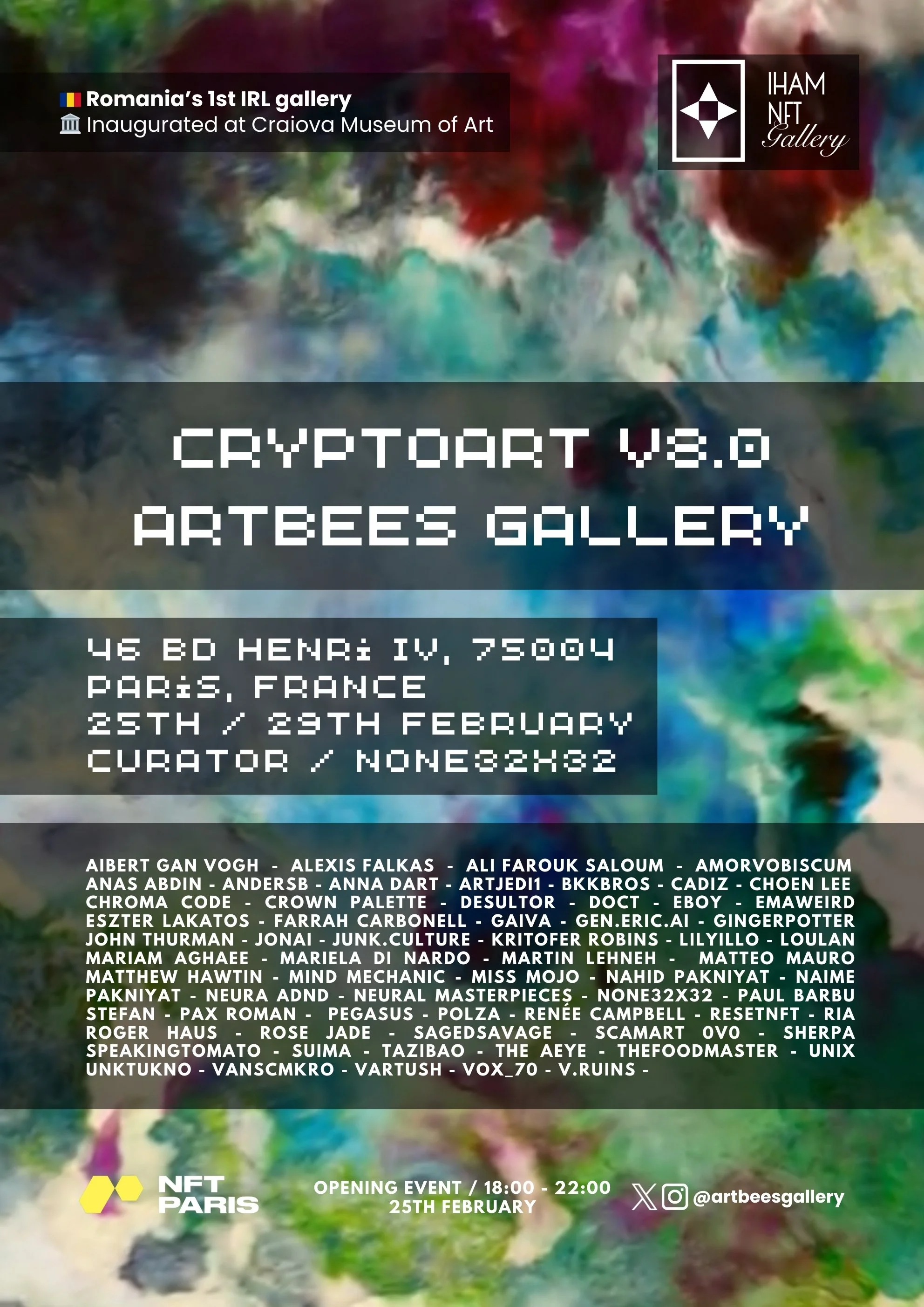 "Beyond" was featured in the Cryptoart V8.0 exhibition at the IHAM Gallery in Paris, France. Curated by NONE32X32 of ArtBees Gallery. Exhibited among 60 artists.
